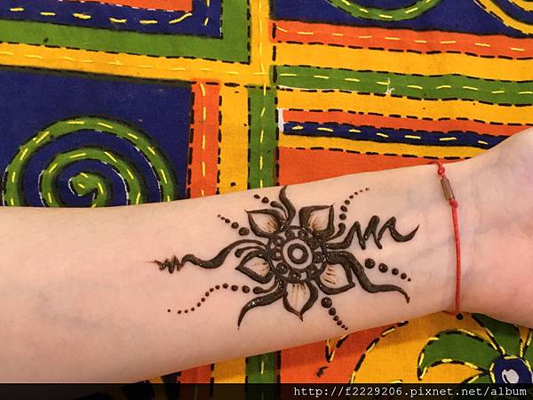 Henna身體彩繪就在Alleys cat正對面的那條巷子 印度新娘都會彩繪是祝福的意思身體彩繪可以維持7-14天 染劑特別強調是植物性染劑不會造成過敏也不會對皮膚有傷害 攤位前掛滿舒吟老師的作品 這肩膀也太美 - 4月 18 週一 201600:30